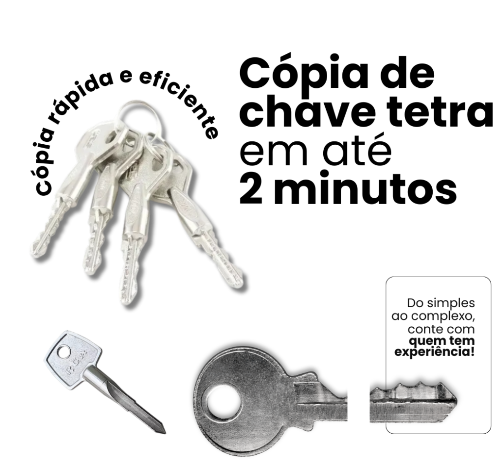 Realizamos cópias de chaves simples, tetra e também recuperação de chaves quebradas, sempre com agilidade, qualidade e acabamento profissional para garantir perfeito funcionamento.